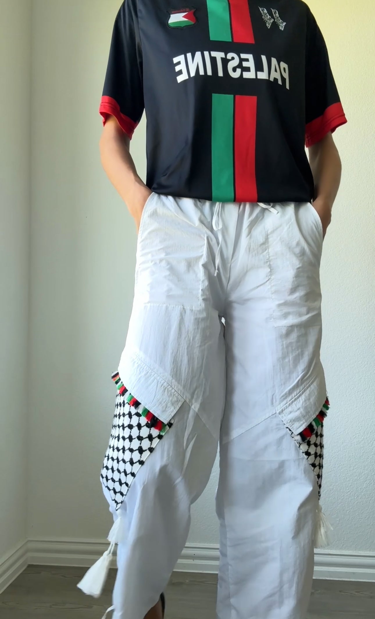 Our SUPER lightweight, windbreaker, cargo pant comes in Black or White with REAL Kuffiyeh pockets! PERFECT to wear with several of our previous pieces, to match! BELT IN WAIST IS FREE SIZED AND TIES. Ankle ties can be loose or tightened for a jogger fit.