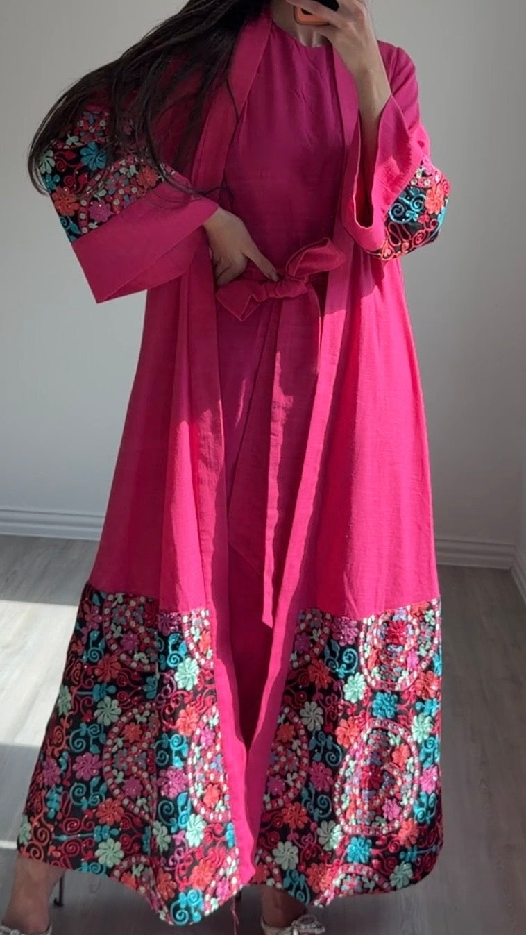 3-piece abaya featuring a sleeve-less soft linen base dress with tie belt, paired with an A-line abaya detailed with rainbow floral stitching.